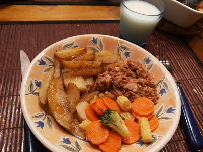 Pakko laittaa loppuun vielä ruokakuva jos toinenkin loppuviikon kokkailuistamme: itse tehtyjä lohkoperunoita, pulled porkia ja kasviksia. Oli kyllä hyväää ♥